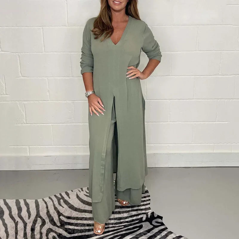 Combina elegancia casual con máximo confort. Este moderno set incluye una maxi blusa con escote en V y abertura lateral, junto con un pantalón ancho y ligero, creando un look sofisticado sin renunciar a la comodidad.